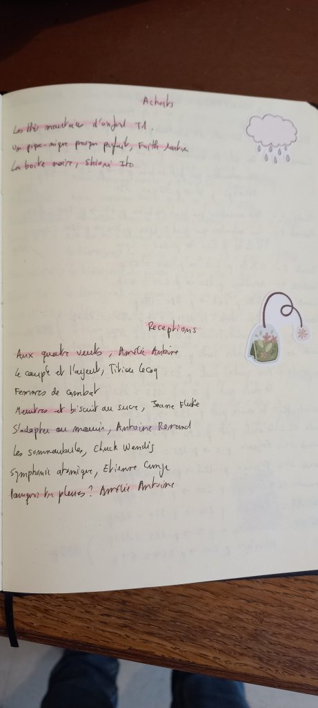 Bonjour Florence, j’ai un journal de lecture, dans lequel je mets chaque mois les livres lus, mais aussi les thĂ©s que j’ai apprĂ©ciĂ©, les sorties que j’ai fais, les campagnes Ulule, etc… un mixte entre journal intime et carnet de lecture. J’y colle des stickers ou des images dĂ©coupĂ©es dans les magazines.