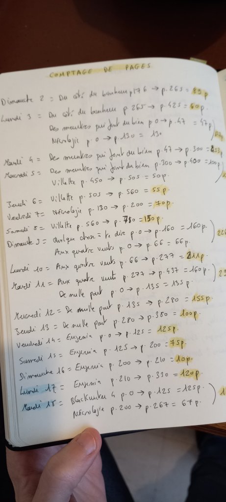 Depuis plusieurs annĂ©es maintenant (en plus de l’appli Evernote) je tiens deux carnets de lecture: un pour noter les entrĂ©es dans la bibliothĂšques et les livres lus depuis 2015, et un qui m’accompagne au quotidien avec mon planning de lecture, des achats et rĂ©ceptions, mon nombre de pages lues…